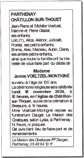 Décédée à Parthenay (79200, France) le mardi 12 novembre 2024 à l'âge de 100 ans