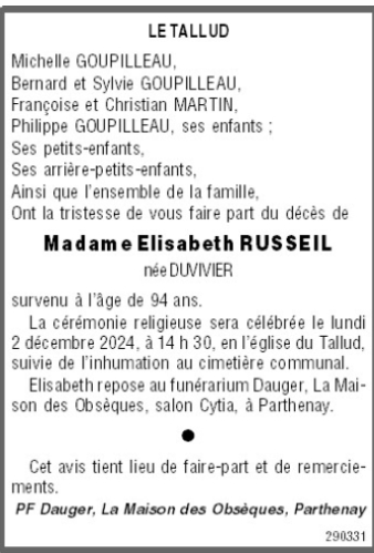 Décédée à Faye-l'Abbesse (79350, France) le mercredi 27 novembre 2024 à l'âge de 94 ans