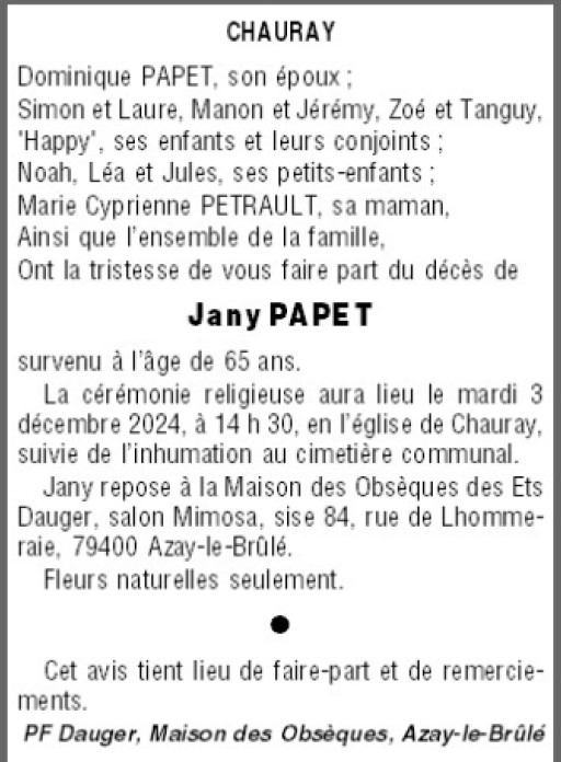 Décédée à Niort (79000, France) le jeudi 28 novembre 2024 à l'âge de 65 ans