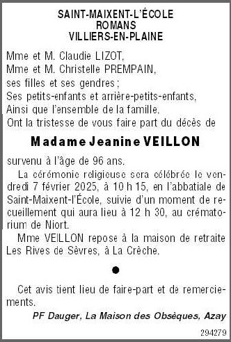 Décédée à La Crèche (79260, France) le samedi 1 février 2025 à l'âge de 96 ans
