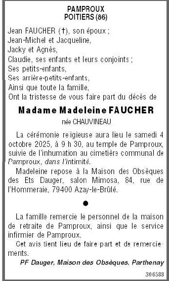 Madame Madeleine FAUCHER née CHAUVINEAU