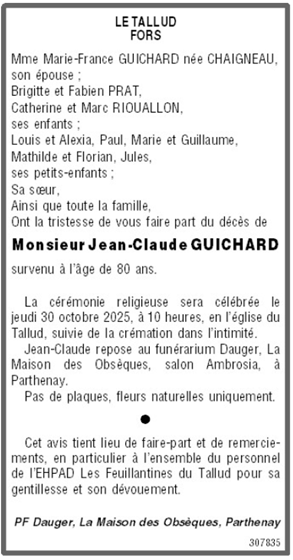 Décédé à Le Tallud (79200, France) le samedi 25 octobre 2025 à l'âge de 80 ans