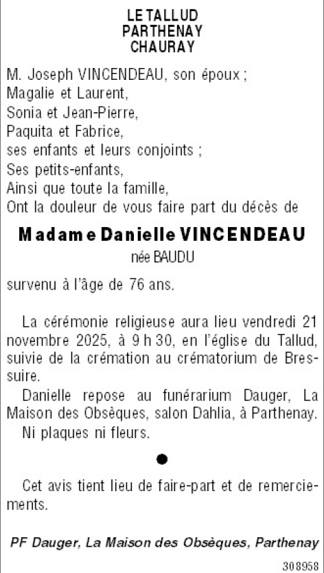 Décédée à Le Tallud (79200, France) le dimanche 16 novembre 2025 à l'âge de 76 ans