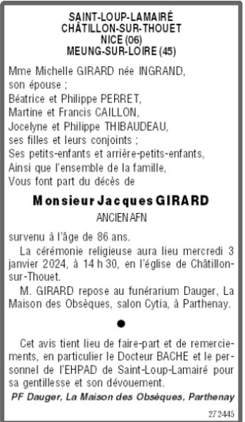 Décédé à Saint-Loup-Lamairé (79600, France) le samedi 30 décembre 2023 à l'âge de 86 ans