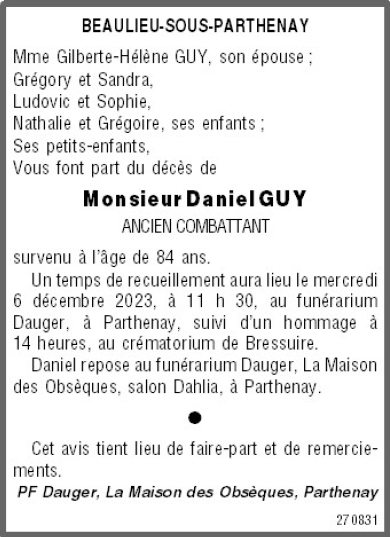 Décédé à Beaulieu-sous-Parthenay (79420, France) le dimanche 3 décembre 2023 à l'âge de 84 ans