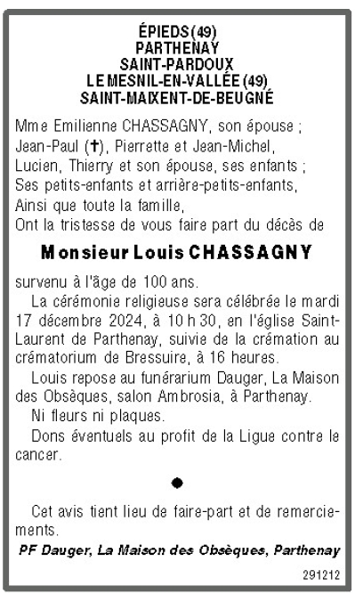 Décédé à Saint-Maixent-l'École (79400, France) le jeudi 12 décembre 2024 à l'âge de 100 ans