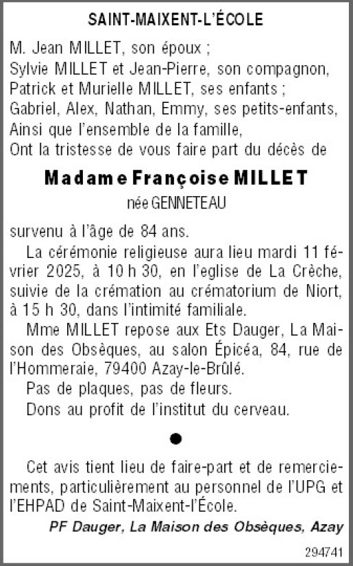 Madame Françoise MILLET née GENNETEAU