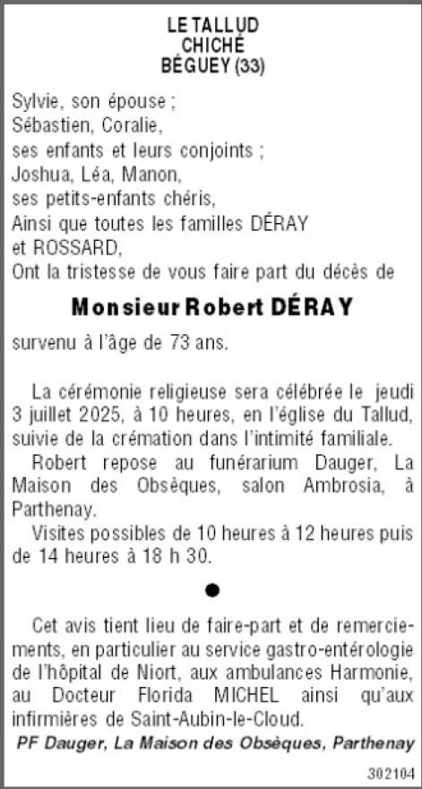 Décédé à Niort (79000, France) le samedi 28 juin 2025 à l'âge de 73 ans