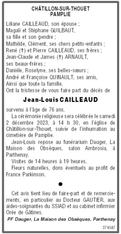 Décédé à Châtillon-sur-Thouet (79200, France) le mercredi 29 novembre 2023 à l'âge de 76 ans