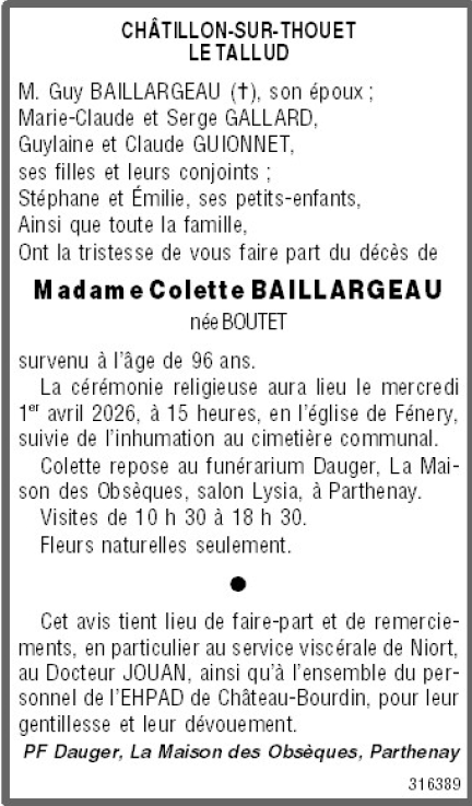 Madame Colette BAILLARGEAU née BOUTET