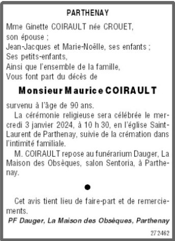 Décédé à Faye-l'Abbesse (79350, France) le vendredi 29 décembre 2023 à l'âge de 90 ans