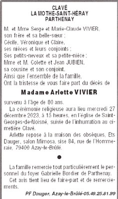 Décédée à Faye-l'Abbesse (79350, France) le dimanche 24 décembre 2023 à l'âge de 80 ans