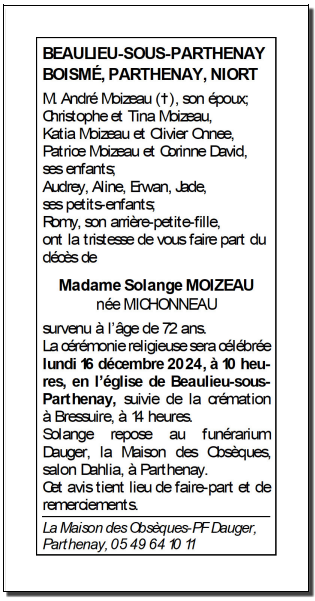 Décédée à Beaulieu-sous-Parthenay (79420, France) le mardi 10 décembre 2024 à l'âge de 72 ans
