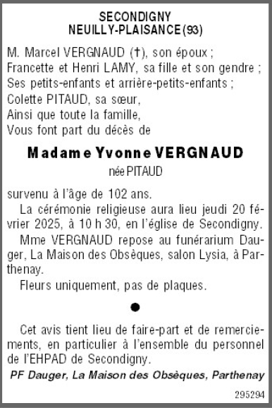 Madame Yvonne VERGNAUD née PITAUD