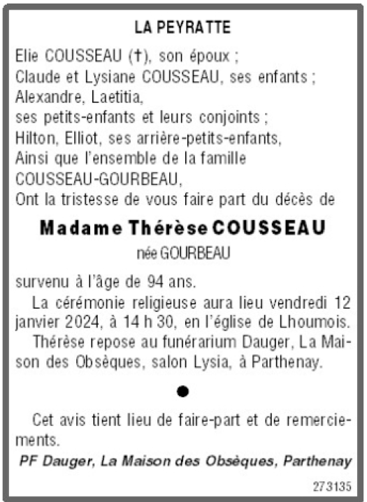 Décédée à Faye-l'Abbesse (79350, France) le mardi 9 janvier 2024 à l'âge de 94 ans