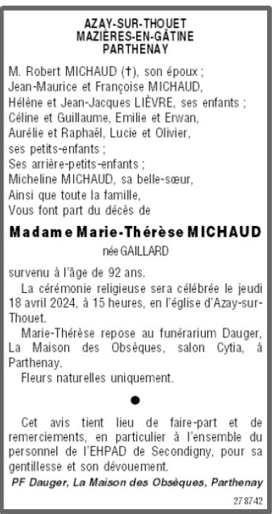 Décédée à Secondigny (79130, France) le lundi 15 avril 2024 à l'âge de 92 ans
