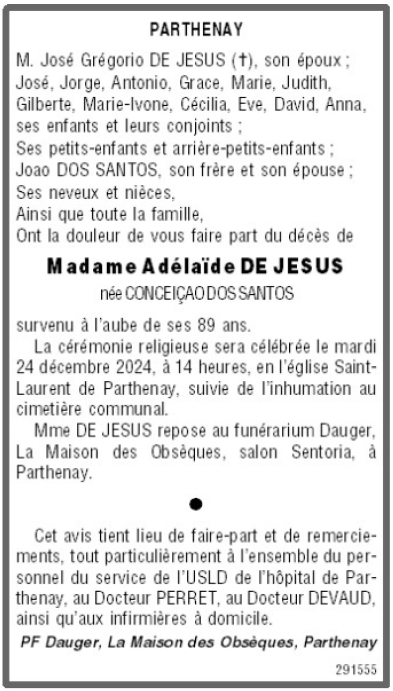 Décédée à Parthenay (79200, France) le jeudi 19 décembre 2024 à l'âge de 89 ans