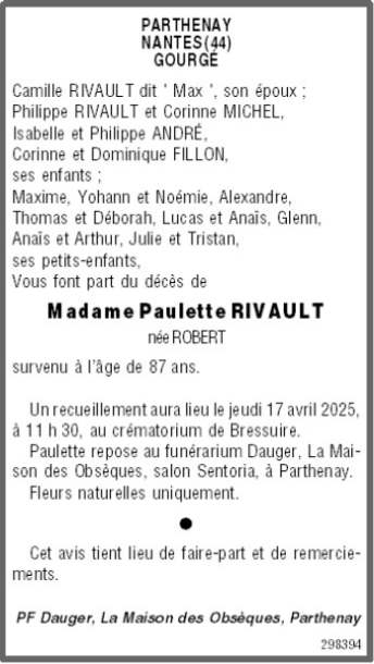 | Madame Paulette RIVAULT née ROBERTDomiciliée à Parthenay (79200, France) Née à Vausseroux (79420, France) le vendredi 20 août 1937 Décédée à Faye-l'Abbesse (79350, France) le dimanche 13 avril 2025 à l'âge de 87 ans Epouse de Monsieur Camille RIVAULT