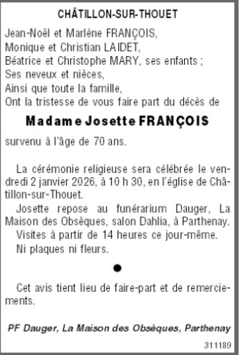 Décédée à Châtillon-sur-Thouet (79200, France) le lundi 29 décembre 2025 à l'âge de 70 ans