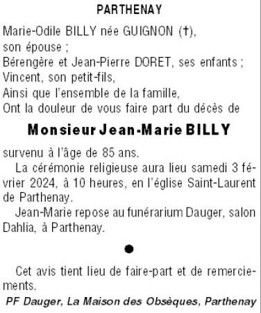 Décédé à Parthenay (79200, France) le mercredi 31 janvier 2024 à l'âge de 85 ans