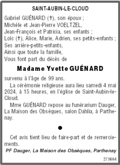Décédée à Thenezay (79390, France) le mardi 30 avril 2024 à l'âge de 99 ans