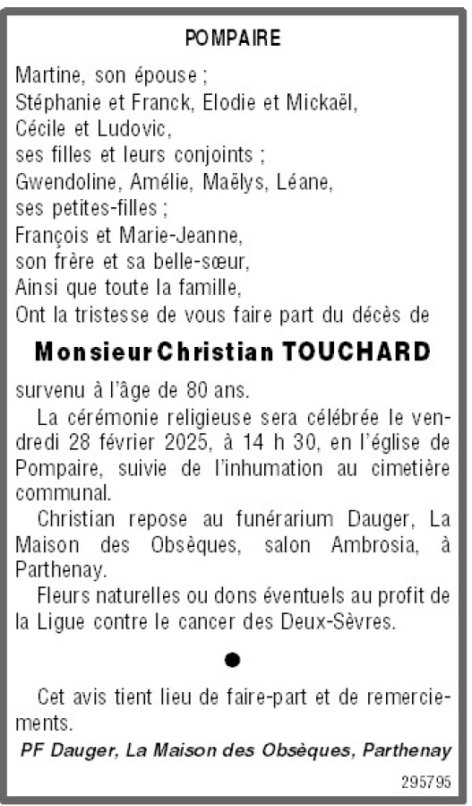 Décédé à Faye-l'Abbesse (79350, France) le lundi 24 février 2025 à l'âge de 80 ans