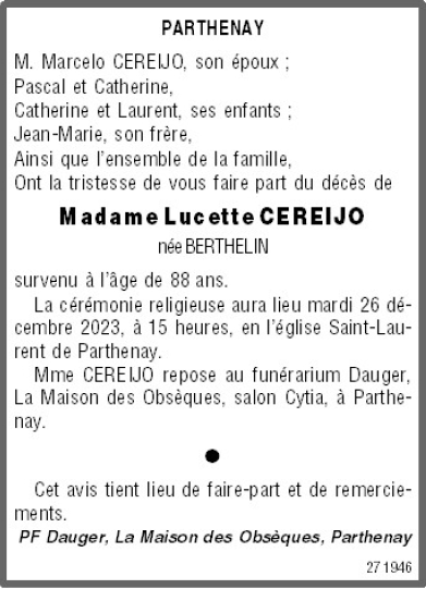 Décédée à Niort (79000, France) le jeudi 21 décembre 2023 à l'âge de 88 ans