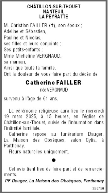 | Madame Catherine FAILLER née VERGNAUDDomiciliée à Châtillon-sur-Thouet (79200, France) Née à Parthenay (79200, France) le jeudi 12 mars 1964 Décédée à Châtillon-sur-Thouet (79200, France) le jeudi 13 mars 2025 à l'âge de 61 ans Veuve de Monsieur Christian FAILLER