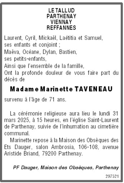 Décédée à Faye-l'Abbesse (79350, France) le vendredi 28 mars 2025 à l'âge de 71 ans